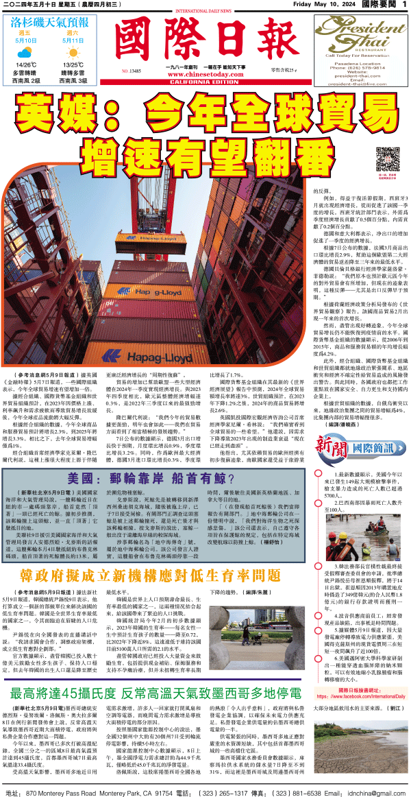 10日國際日報1-國際要聞 发布日期:2024/5/10 来源:國際日報 打印