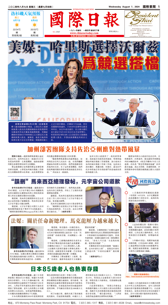 7日國際日報1-國際要聞 发布日期:2024/8/7 来源:國際日報 打印