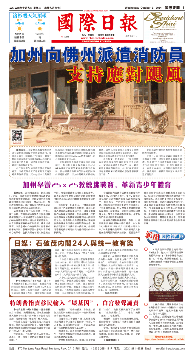 9日國際日報1-國際要聞 发布日期:2024/10/9 来源:國際日報 打印