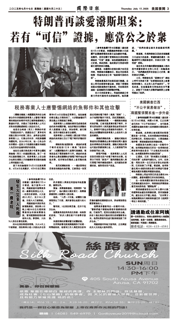 17日國際日報17-美國要聞 发布日期:2025/7/17 来源: 打印