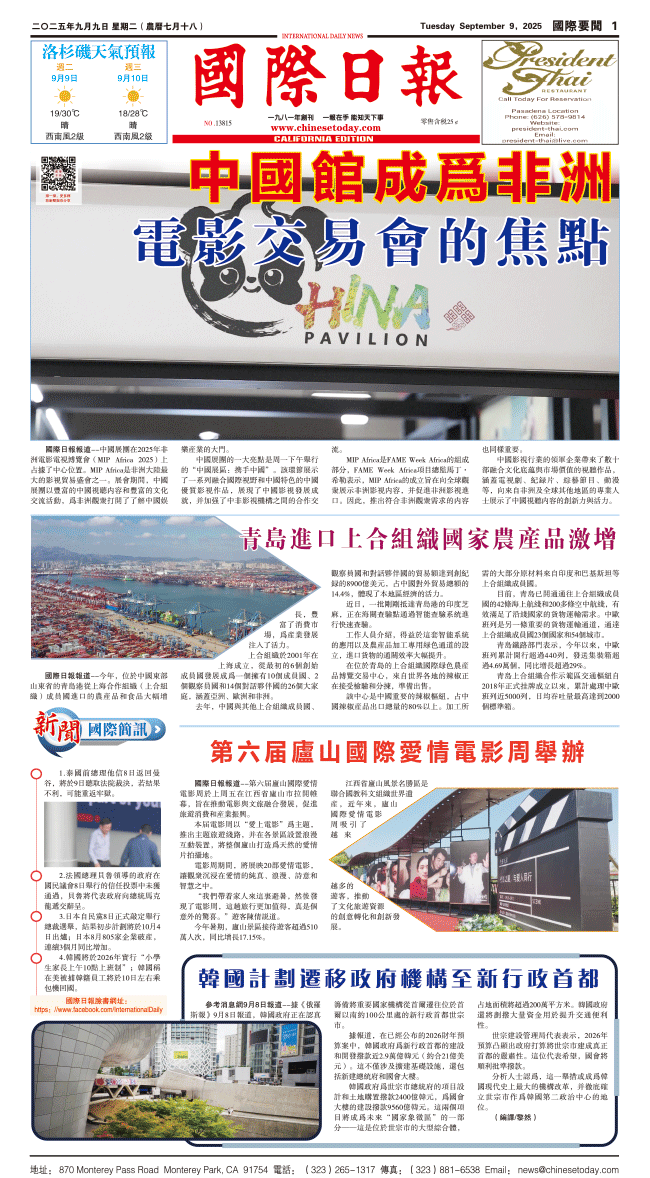 9日國際日報1-國際要聞 发布日期:2025/9/9 来源:國際日報 打印
