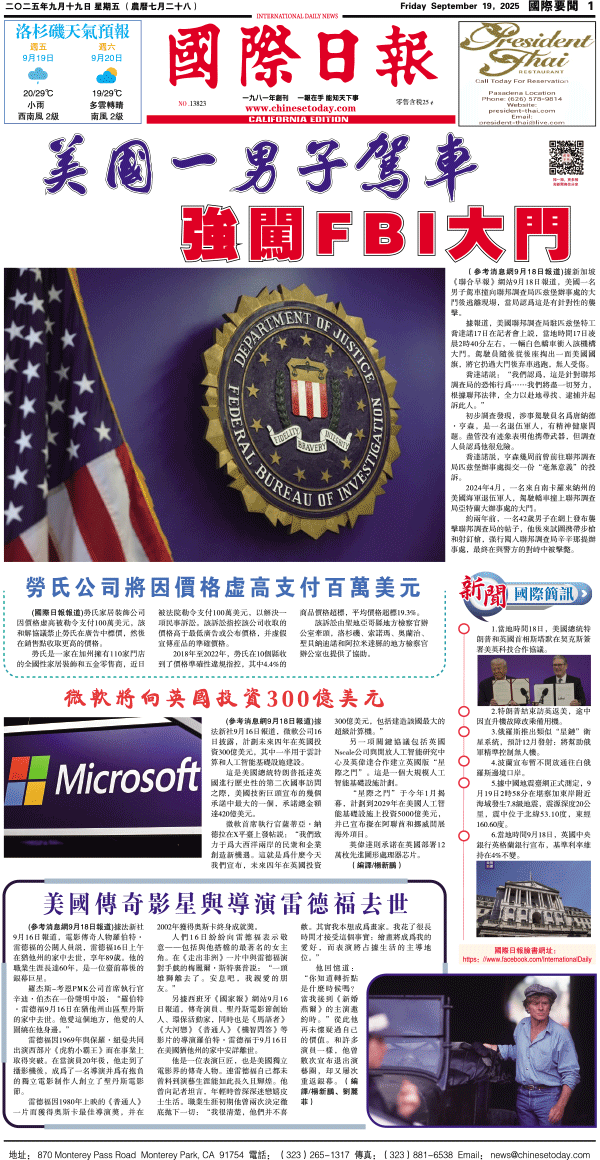 19日國際日報1-國際要聞 发布日期:2025/9/19 来源:國際日報 打印