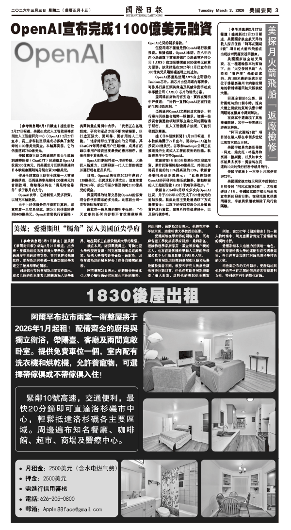 3日國際日報3-美國要聞 发布日期:2026/3/3 来源: 打印