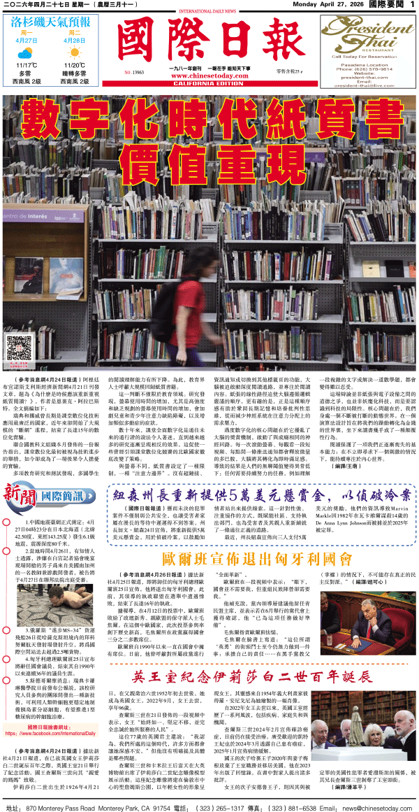 27日國際日報1-國際要聞 发布日期:2026/4/27 来源:國際日報 打印