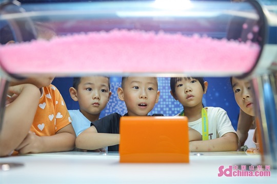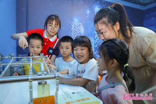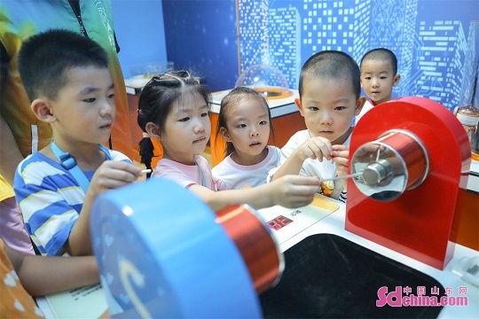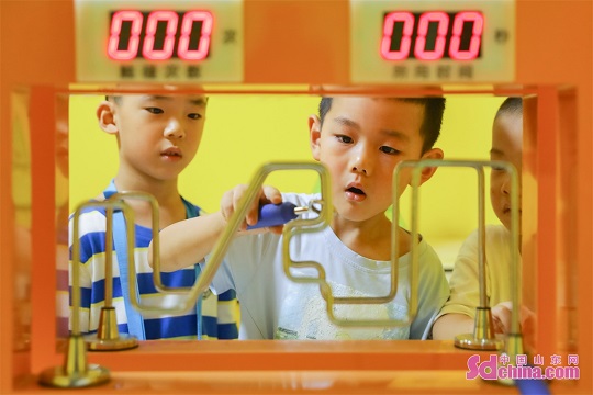 Children are seen experiencing the fun of scientific experiments through hands-on activities such as hand-eye coordination, dancing paper clips, and sound standing waves at a Science Popularization Museum in Qingdao City, Shandong Province. (Photo by Zhang Ying)