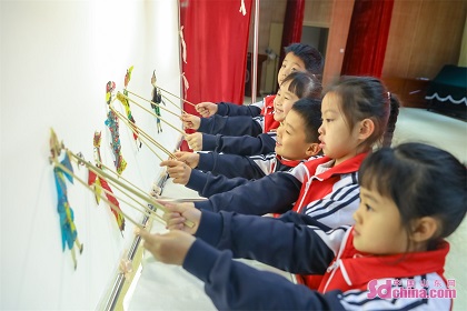 Students in Chongli Primary School in Qingdao, East China’s Shandong Province, learn to make paper cuts and shadow puppetry, and paint on kites to feel the charm of Chinese intangible cultural heritage on Feb. 6, the first day of spring term. (Photo by Zhang Ying)