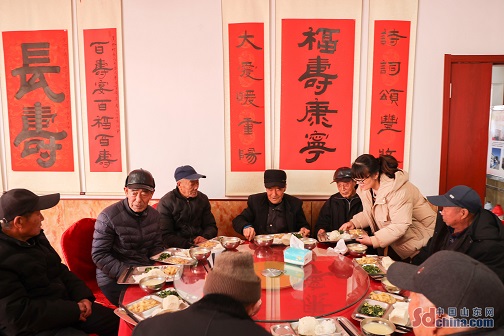 Photo taken on February 27, 2024, shows the elderly enjoying food and performances in the canteen for the elderly in Xucun Village, West Coast New Area of Qingdao, Shandong Province. The Canteen for the Elderly, set up by Xucun Village, provides lunch for the elderly every Monday to Friday to solve the dining problem for the elderly and bring warmth to them. (Photo by Han Jiajun)
