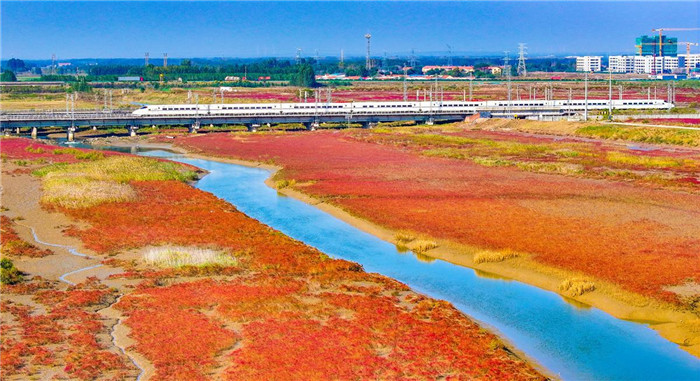 Every fall, Red Beach in Hongshiya subdistrict of Qingdao's West Coast New Area in Shandong province is transformed into a vivid natural masterpiece. Vibrant fields of deep red Suaeda glauca Bunge — known locally as jianpeng grass — blanket the landscape.