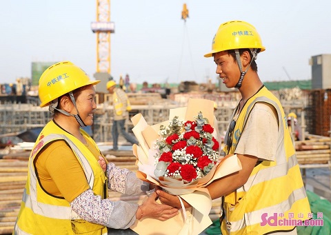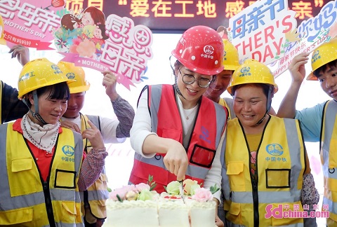 A heartwarming activity was held on a construction site in Qingdao, E China’s Shandong province to celebrate the Mother’s Day, with sons and daughters sending flowers, sunhats and cakes to their mother. (Photo by Zhang Jingang)