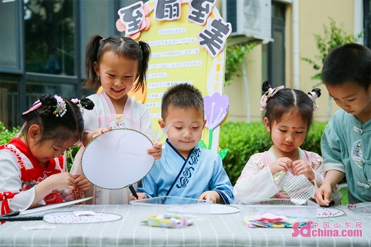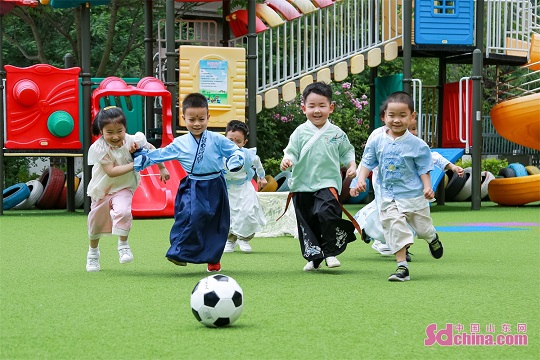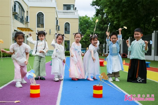 Kids in the kindergarten welcomed the Day in a traditional way by playing traditional games such as Cuju, pitch-pot game and making scented fans. (Photo by Zhang Ying)