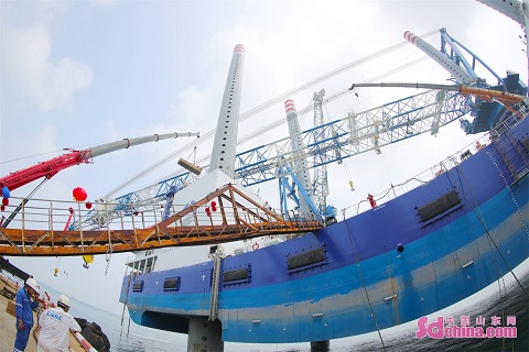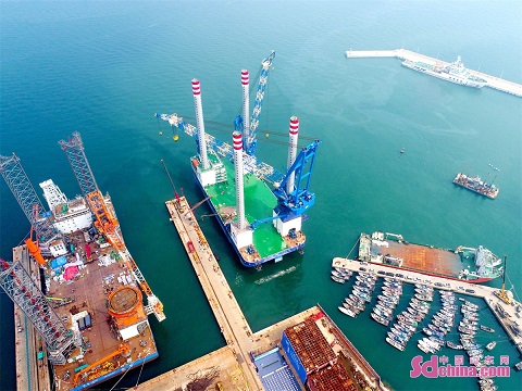 The platform is 106.6 meters long, 44.2 meters wide, and 8.45 meters deep, with pile legs measuring 110 meters, capable of accommodating and installing the largest offshore wind turbines in China. (Photo by Zhang Jin'gang)