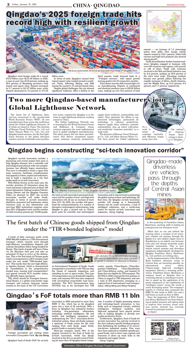 1/30-International Daily News-China Qingdao 发布日期:2026/1/30 来源:International daily 打印