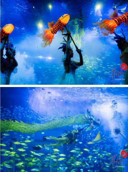 新春期间,广州正佳文旅联合陕西旅游的“金字招牌”华清宫超级 IP,在海洋馆里推出了《海底龙凤呈祥》大秀,精彩的美人鱼表演把中国浪漫主义文学的绝美皇家爱情故事演绎得淋漓尽致,让人身临其境。这是全国首次男龙鱼惊艳亮相广州,也是全国首次海底龙凤大秀,更有雄风气概的海底舞龙震撼同框。
