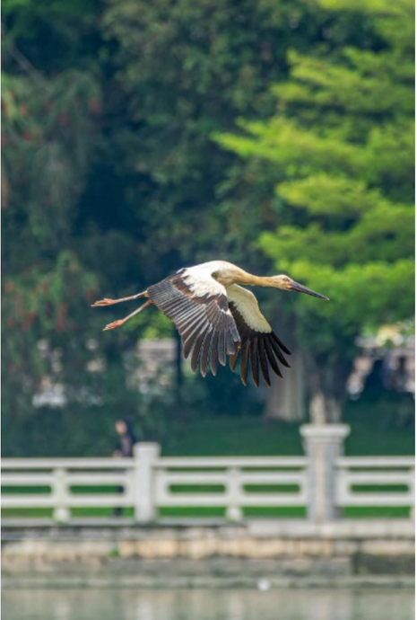 Lingnan: Beauty Beyond Borders | On April 9, Haizhu National Wetland Park in #Guangzhou welcomed a heavyweight newcomer, the state-level key protected wildlife species, Ciconia boyciana, which marks the discovery of the second state-level key protected #wildlife species in the park after the Yellow-breasted Bunting, bringing the total number of #bird species in #Haizhu Wetland to 197. The Ciconia boyciana is a large wading bird belonging to the #stork family, characterized by its graceful stature, black beak, red skin around the eyes, and white iris. It usually inhabits shallow waters near lakeshores. Due to its narrow breeding distribution and scarce numbers, it is currently listed as globally endangeredspecies.#SplendidLingnan