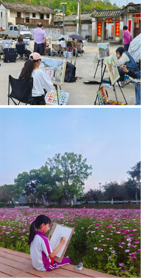 Lingnan: Beauty Beyond Borders | Beitang Village in Xihe Town, Meizhou, on the banks of the Zhangxi River, has a history of more than 800 years since it was founded at the end of the Song Dynasty and the beginning of the Yuan Dynasty. After a few rains in May, the #bamboo forest along the Zhangxi River becomes more and more verdant. The seedlings in the paddy fields, the wild #flowers on the hillside, the periwinkle houses beside the village road, and the villagers taking a walk... They all form a beautiful #countryside scene, which just happened to be depicted on the boards by the painters who came to sketch to record this wonderful moment. #SplendidLingnan