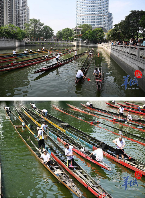 “农历四月八,起龙船啦!”农历四月初八是广州多村“起龙”的日子。5月15日上午,伴随阵阵鞭炮声和有节奏的鼓声,广州天河区猎德村起龙仪式正式开始。仪式现场,只见藏龙塘上龙舟整齐排列,露出船头船尾,数名青壮年正对船身进行清洗。据悉,今年猎德村共有12条龙舟起龙,包括红龙、花龙、五色龙,以及一条历史悠久的“冠军”金龙。