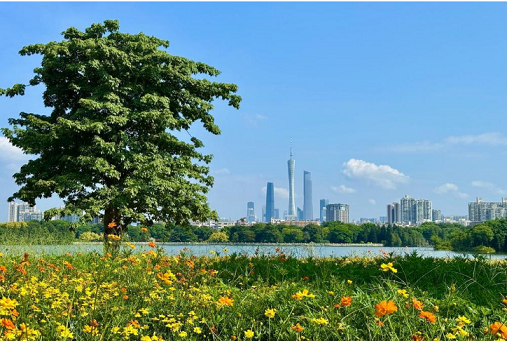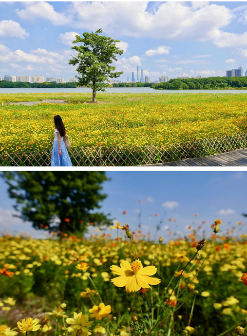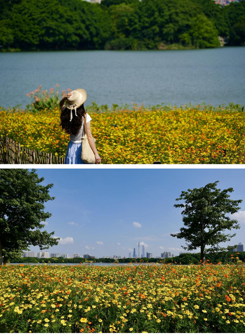 Lingnan: Beauty Beyond Borders | In Haizhu Lake Park, #Guangzhou, nearly 14,000 square meters of two-colored cosmos sulphureus flowers and flowering tobacco plants have ushered in the early flowering period. Along with the sunshine, the yellow and red #flowers under the blue #sky and white #clouds create a scene reminiscent of entering the #romantic world of Hayao Miyazaki's manga. It is understood that the #sea of flowers will continue until after the National Day #holiday. If you love flowers, don't miss this romantic scenery.#SplendidLingnan