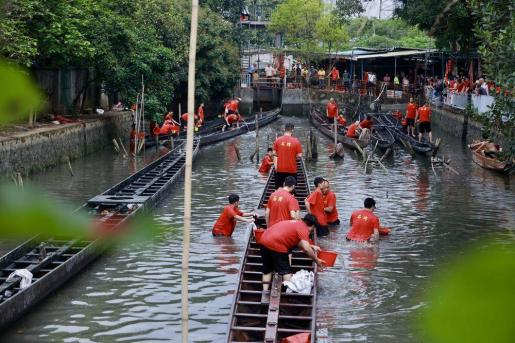 5月5日,广州市天河区石牌村的上百位“桡手”齐聚黄埔区双岗村。沉睡了一年的8条龙舟在百位“桡手”的合力下破水而出,鞭炮齐鸣,龙船鼓响。经过后续修缮,沉睡的“蛟龙”将恢复雄姿,龙首昂扬,只待端午竞渡时劈波斩浪。