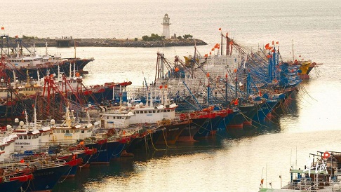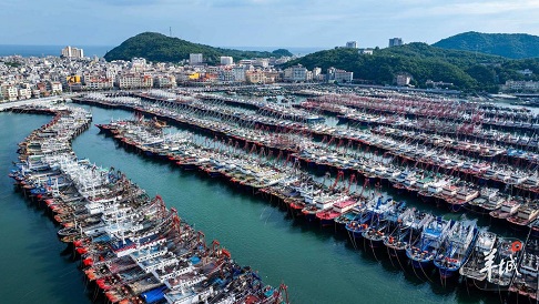 9月23日,阳江海陵岛闸坡渔港桅杆林立、千帆归港,八百余艘船只在晚霞中静静地停靠在港湾内,为抵御台风做好准备。