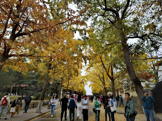 一叶知秋。秋季最美的时分,莫过于金黄的银杏叶撒落成毯。今日清晨的小雨和降温,让八大关有了深秋的凉意。上午10时,居庸关路满目的“金黄”吸引了大量的游客前来打卡拍照。整条路上,金黄的叶子在空中旋转、飞舞、飘落。叶子与秋风摩擦后的“沙沙”声;脚踏落叶的“嚓嚓”声和人们的欢笑融为一体,奏响一曲独属青岛的秋日交响乐。(青岛日报观海新闻记者 王雷 文/图/视频)