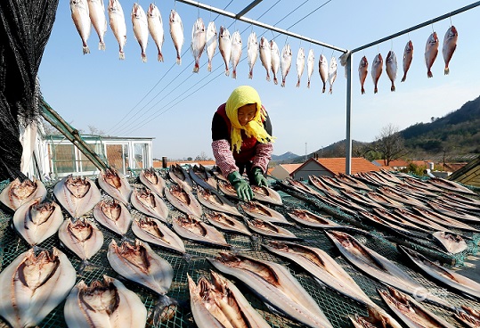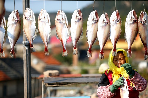 初冬时节,青岛市沿海一带的渔民抓住晴好天气,忙着将捕获的鲅鱼、偏口鱼、鳗鱼等20余种海鱼进行切割、腌制、晾晒,加工成鱼干,并通过线上线下的形式销往全国各地,助力增收致富。图为即墨区鳌山卫街道垛石村渔民在晾晒鱼干。 (青岛日报/观海新闻记者 王涛 通讯员 梁孝鹏 文/图)