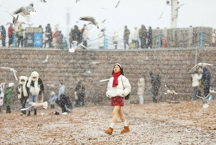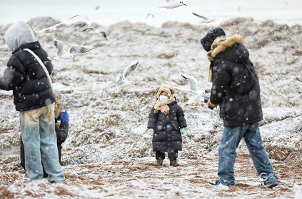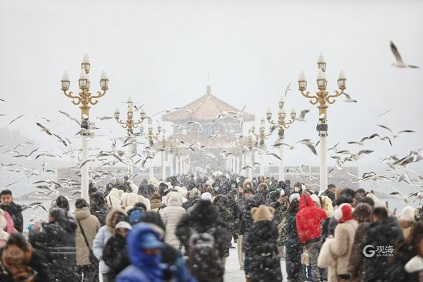今天上午,一场突如其来的大雪将冬日的岛城装扮得银装素裹,观海新闻记者在栈桥看到,许多市民和游客冒雪赶来与海鸥互动,享受着雪花和海鸥给他们带来的欢乐。(青岛日报/观海新闻记者 韩星 文/图)
