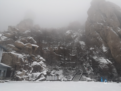 今天,崂山风景区巨峰游览区迎来兔年立春以来的首场降雪。这场雪带来了冬春交替的浪漫,也以润泽万物的方式为春天“造势”。
