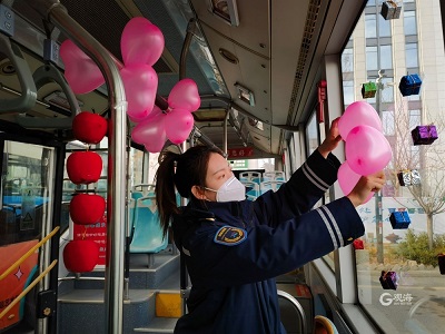 写满甜蜜话语的卡片、彩色气球、玫瑰花朵、交友信息……2月14日是情人节,在这个有爱的日子里,城运控股交运温馨巴士31路、604路、607路、608路、隧道8路装扮一新,变身“爱情巴士”穿行于青岛街头。