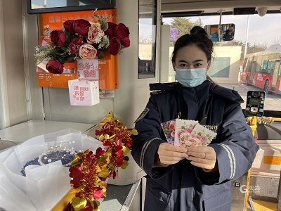 14日上午,以“丘比特”为主题的隧道8路比往日多了几分浪漫色彩。车厢两侧展板、扶手上都粘贴了情人节限定情话,车头还放置着一对可爱的兔子情侣公仔,浪漫氛围十足。最是人间好风景,你与春色两相宜;落日一点如红豆,已把相思写满天……一句句甜蜜的情话写在爱心卡片上,吸引着车上的乘客不停翻看。“每句话都好甜,今天的朋友圈文案就从这里面选了。”乘客李女士边拍照边说道。