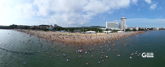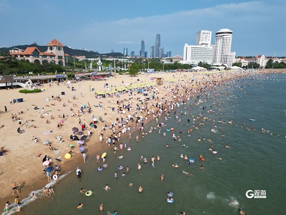 在青岛,海水浴场是市民游客最愿意去的地方。在第一海水浴场,既可以看到海天一色的滨海风光,也可以远眺红瓦绿树的青岛历史老城。不仅本地市民爱来这里“洗海澡”,外地游客更是将其作为来青必打卡之地。7日下午的第一海水浴场开启“人从众”模式,市民游客除了洗海澡,还在沙滩上晒太阳,体验水上娱乐工具或者玩着沙滩排球。(青岛日报/观海新闻记者 王雷 摄影报道)