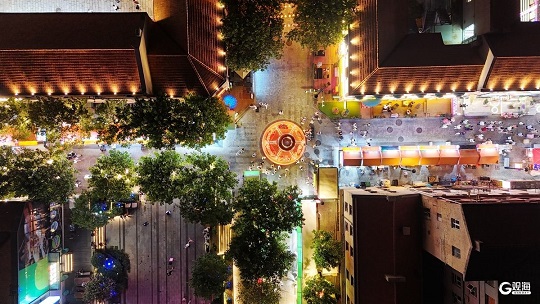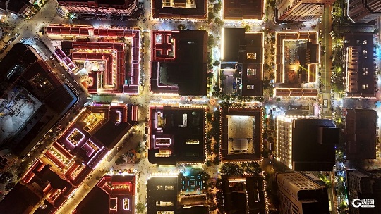 俯瞰之下,老建筑错落有致、街道循环相通、游客熙熙攘攘,在各色灯光的映衬下,夜色璀璨、尽显繁华。