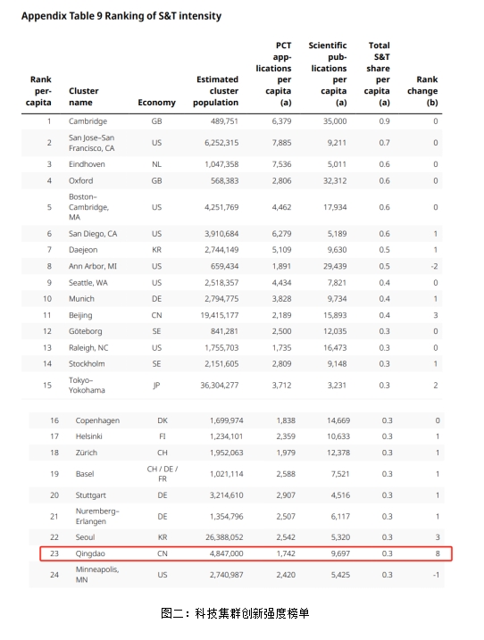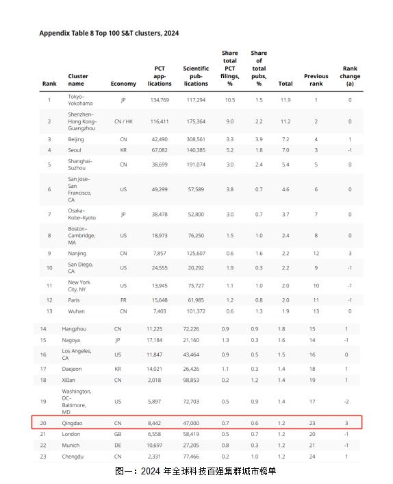 近日,世界知识产权组织公布《2024年全球创新指数报告》百强科技集群城市榜单,青岛跃居全球科技创新集群百强榜第20位,比2023年度提升3个位次。与此同时,在公布的科技集群创新强度榜单中,青岛位列中国上榜城市第2位,仅次于北京,比2023年度提升8个位次。