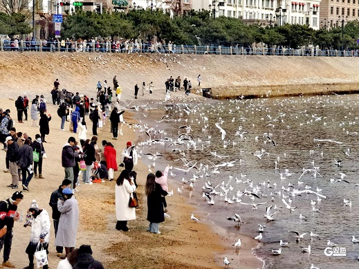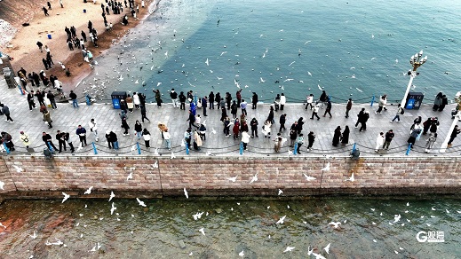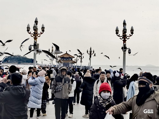 16日下午,天清气爽,在冬日暖阳下,回澜阁的红墙金顶显得格外瑰丽。游客们漫步栈桥,其中既有举家出动的“家庭团”,也有亲朋挚友相约出游。他们一边和海鸥嬉戏,一边拿起相机或手机记录美好的瞬间。(青岛日报/观海新闻记者 王雷 文/图)