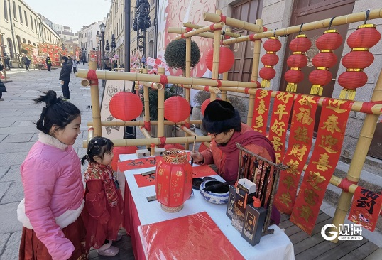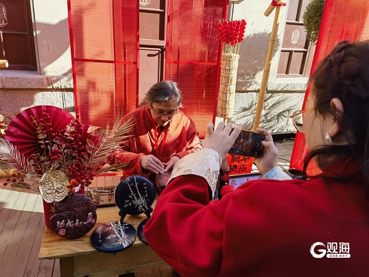大年初一上午,市南区黄岛路的民俗“摊”已经摆起来。剪纸、拓印、花灯、春联……一个个充满非遗色彩的展点吸引了市民游客的目光。
