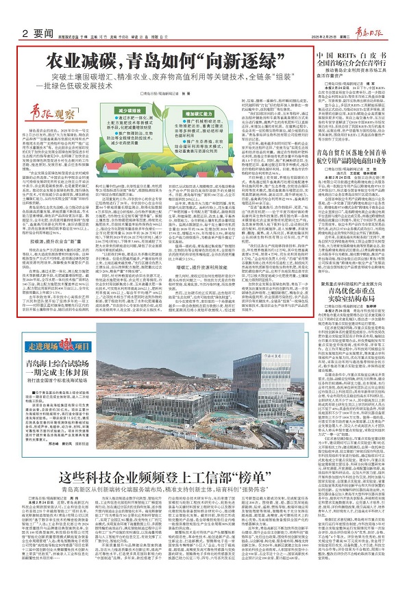 加快农业发展全面绿色转型,青岛下一步将更加注重发挥农业科技创新作用,进一步突破绿色品种培育、土壤固碳增汇、精准农业、废弃物高值利用、农业面源污染防控、农产品品质评价等关键技术,全链条“组装”一批绿色低碳发展技术,推动农业生产效率与农产品品质双提升。(青岛日报/观海新闻记者 张晋)