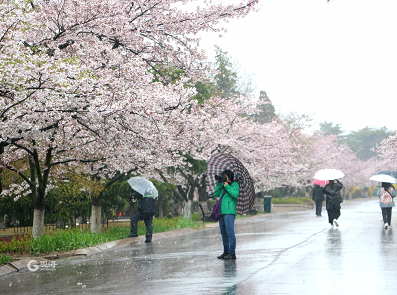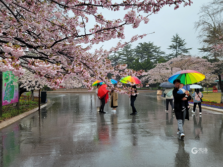 受江淮气旋和冷空气共同影响,今天,青岛出现明显强降雨和大风天气。春雨贵如油,本次降雨将明显改善土壤墒情,缓解我市当前旱情,并缓解森林防灭火压力。春雨润城,雨中赏樱别有一番意境,在中山公园里,雨中的樱花争相吐艳,不少市民驻足观赏,拍照留念。