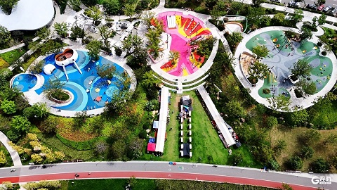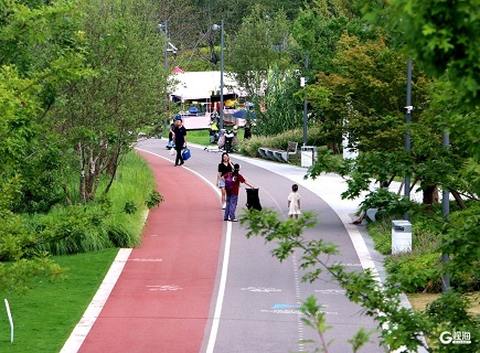 木栈道上满是悠闲身影,大人牵着孩子慢慢走,草坪上支起帐篷,野餐垫铺开,亲朋好友围坐聊天,笑声随河风荡开。不远处游乐场传来欢闹,秋千、滑梯成了孩子们的最爱。