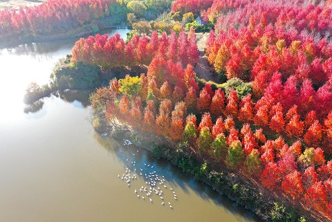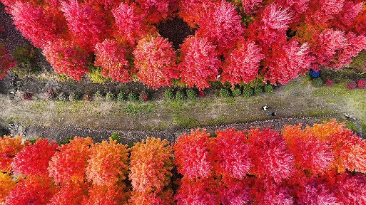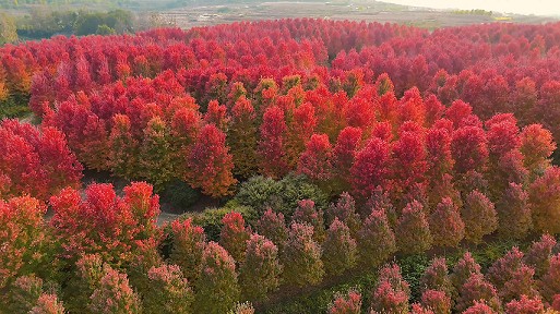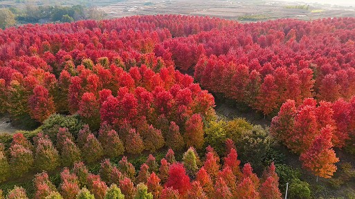 眼下,正是赏枫好时节。位于即墨区金口镇青山前村的枫树林一片火红,迎来一年当中最美的季节。从高空俯瞰,枫林宛如一块块色彩斑斓的拼图;置身林中,枫叶由绿转红、绚丽多彩。这般别样的秋日浪漫,吸引不少游客前来观光。(青岛日报/观海新闻记者 王涛 文/图)