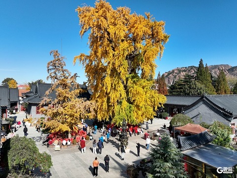 站在树下仰望,虬枝盘结如时光的笔触,将阳光筛成碎金,与漫天黄叶一同洒落。每一道叶脉都镌刻着千年风霜。树影与古寺飞檐交织,青瓦金叶,构成这个时节最诗意的画卷。微风拂过,落叶如金雨般翩跹而下,地面上仿佛铺就了一条金色的地毯。游客们或仰首拍照,或漫步叶间,记录这限定版的深秋浪漫。(青岛日报/观海新闻记者 王雷 文/图)