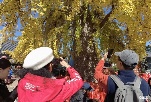 随着银杏叶由绿转黄,位于城阳区夏庄街道的法海寺再次成为市民游客瞩目的焦点。寺内一棵树龄高达1600余年的古银杏树已经进入最佳观赏期,满树金黄,蔚为壮观。今天中午,观海新闻记者在法海寺看到,虽然不是节假日,前来观赏打卡的市民游客依然络绎不绝。