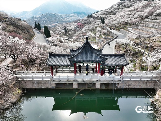 走进大崂樱桃谷,只见层层梯田被粉白色的花海覆盖,宛如一幅天然的田园画卷。游客们或漫步于蜿蜒小径,近距离欣赏樱桃花娇艳的姿态;或登高远眺,将漫山花海与远处青山、村落尽收眼底。