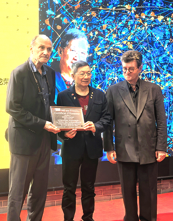 仪式上,法方代表及黄建南先后致辞。随后,巴黎大皇宫 Art Captial 2024国际艺术展轮值主席雅克·达楼兹(Jacques Daloze)向黄建南颁发《法国独立沙龙荣誉奖》,并与巴黎大皇宫独立沙龙组委会主席雅克·罗西瓦杰(Jacques Rochvarger)、巴黎大皇宫独立沙龙组委会办公室主任阿瑞万·文森(Areewan Vincent)一起合影留念。