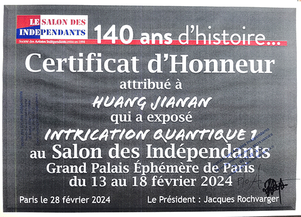 法国大皇宫ART CAPITAL国际艺术展颁发给黄建南的《获奖证书》