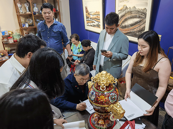 活动前后,很多已经收藏了黄建南的作品的“黄粉”,不辞辛劳,纷纷带上作品前来与黄建南合影,尽享自己与艺术大师及其作品同框的荣耀。光合影还不够,“黄粉”们还不失时机地拿出《黄建南画册》,请黄建南亲笔题字签名。
