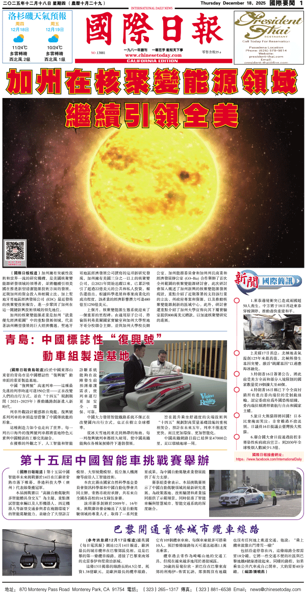 18日國際日報1-國際要聞 发布日期:2025/12/19 来源:國際日報 打印