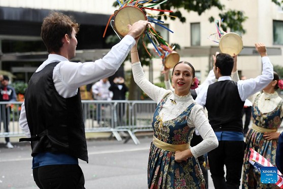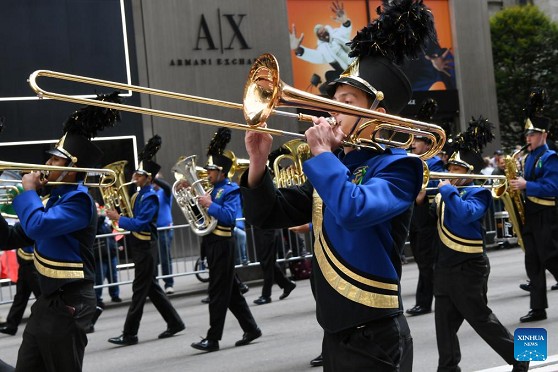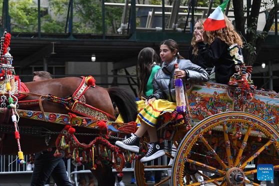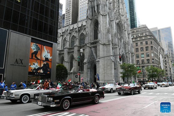 People take part in the Columbus Day parade on Manhattan's Fifth Avenue in New York, the United States, Oct. 9, 2023. The Columbus Day, which marks the landing of the Italian-born explorer Christopher Columbus, was held here on Monday. (Xinhua/Li Rui)