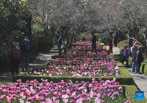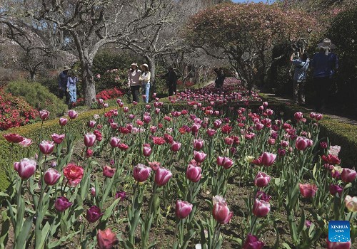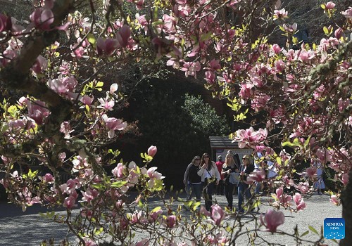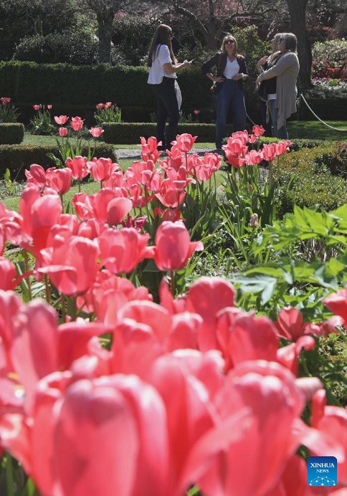 People enjoy the spring scenery at the Filoli Historic House & Garden in Woodside, the United States, March 18, 2024. (Photo by Liu Yilin/Xinhua)