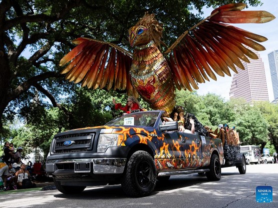 A decorated vehicle participates in the 37th Houston Art Car Parade in Houston, Texas, the United States, April 13, 2023. The annual event attracted over 250 vehicles and entries from 23 states, drawing in more than 250,000 spectators. (Photo by Chen Chen/Xinhua)