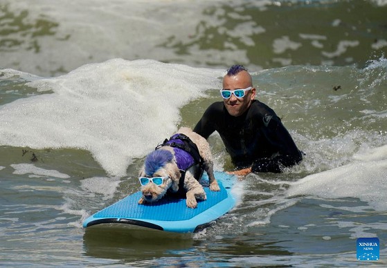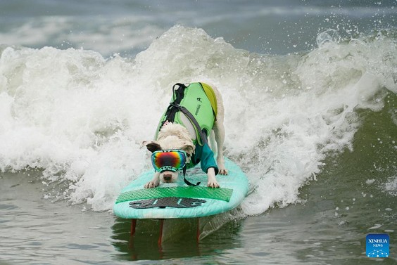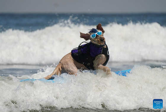 A dog is pictured at dog surfing championships in Pacifica, California, the United States, Aug. 3, 2024. (Photo by Li Jianguo/Xinhua)