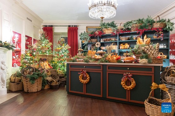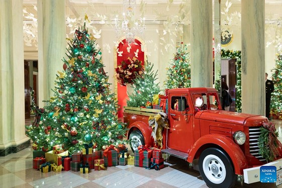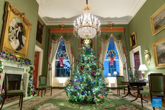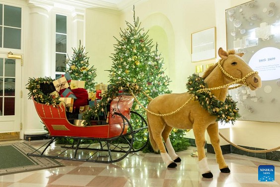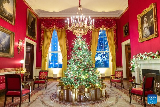 Photo taken during a media preview on Dec. 2, 2024 shows holiday decorations at the White House in Washington, D.C., the United States. (Xinhua/Hu Yousong)